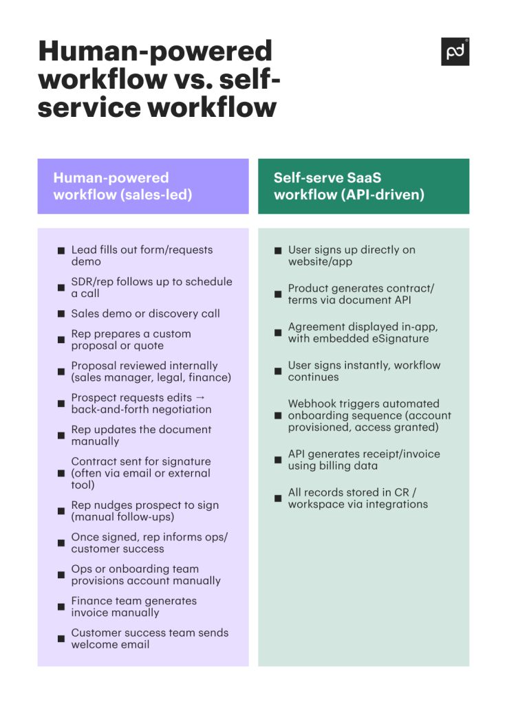 High volume of sales transactions with minimal touchpoints. In traditional sales, reps assist with keeping deals on track. In self-serve SaaS, thousands of users sign up, renew, or upgrade nearly every day without reps in the loop. To facilitate those transactions, background automation provided by document management APIs and similar tools becomes the only reliable way to handle that volume.