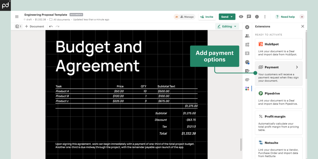 Example of a PandaDoc quote template for a manufacturing job