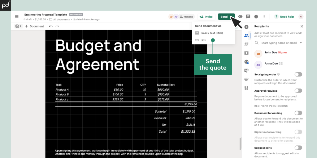 Here are the steps for using a manufacturing quote template with PandaDoc: