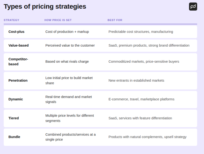 There are seven most common pricing strategies, including: cost-plus, value-based, competitor-based, penetration, dynamic, tiered, and bundle pricing. Each of these strategies work well for different business models, markets, and growth stages. You can see the comparison above for a breakdown.