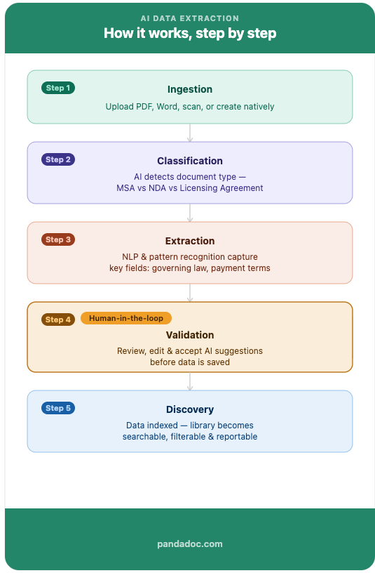 AI data extraction solves these challenges by turning static documents into structured, searchable data your teams can act on, whether those contracts were signed yesterday or five years ago. In this guide, we’ll explore exactly what AI data extraction is, why it delivers transformative value for growing businesses, and what features to prioritize when evaluating solutions.