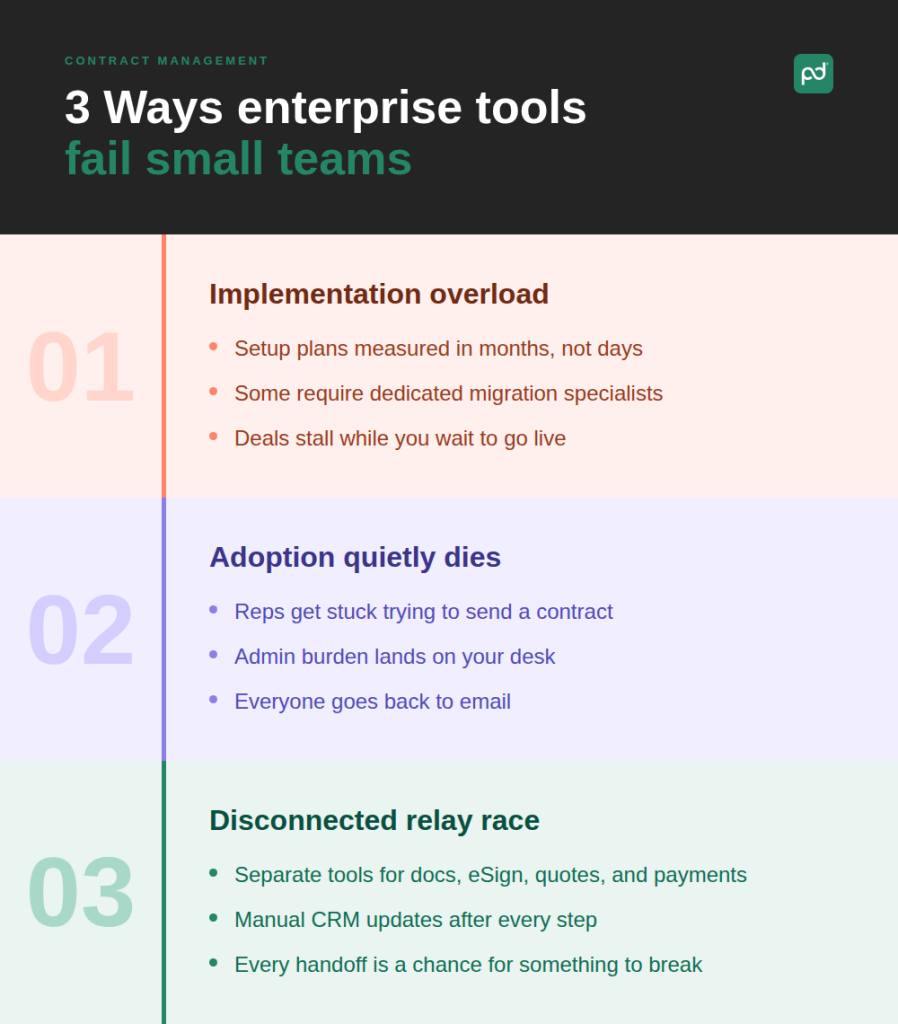 That gap is the result of an entire category built for someone else. The contract management software market was designed for enterprise teams, and small businesses have been trying to force it to fit ever since.